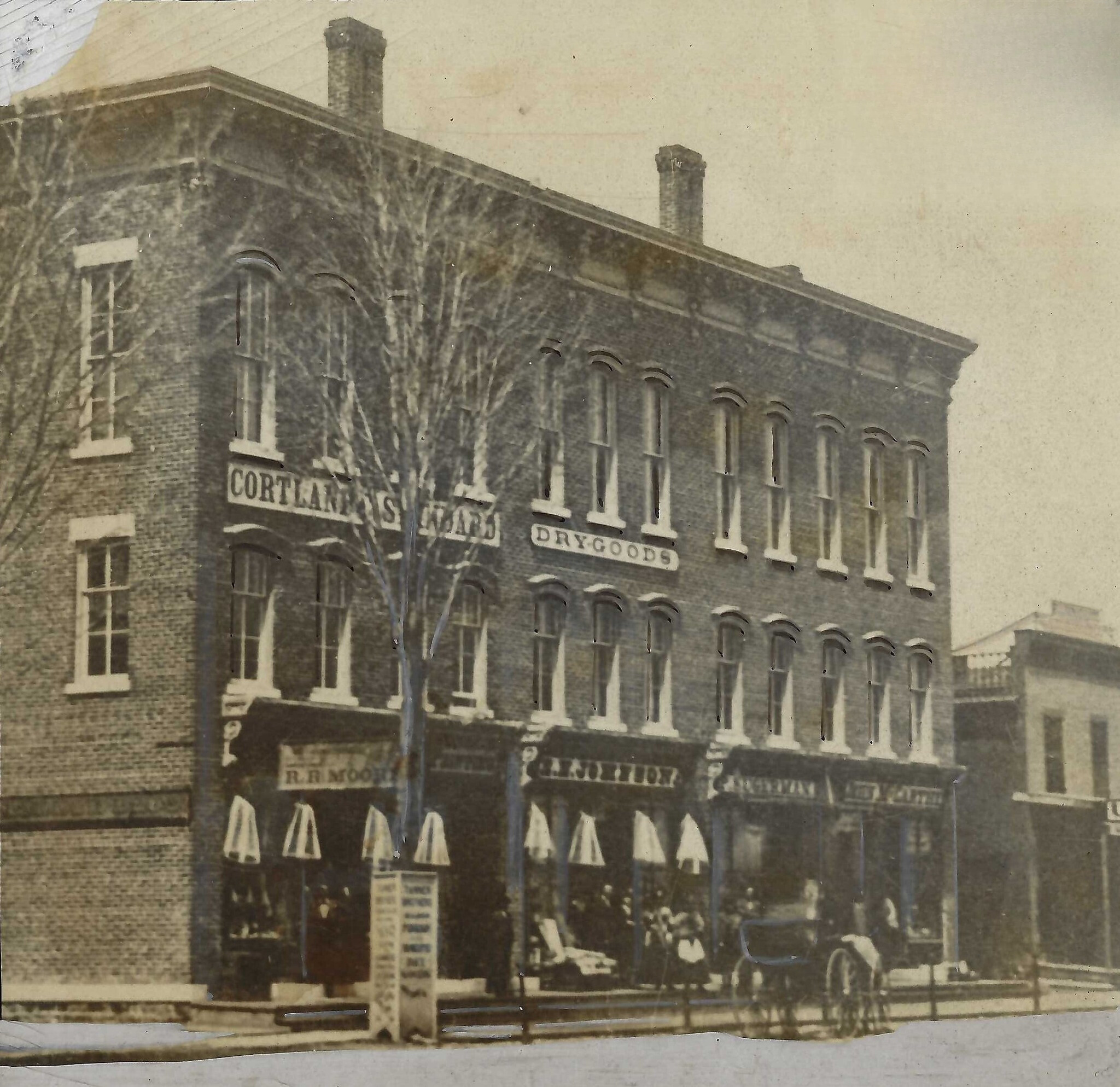One year after the Masonic Hall Block was constructed, in 1868, another section was added to the structure at no.28, and although the front made it appear as though it had been all built as one block, it was referred to separately as the Moore Block. The Tanner Bros. sold their dress and fancy dry goods out of the storefront on the first floor, while the Cortland Standard operated above.