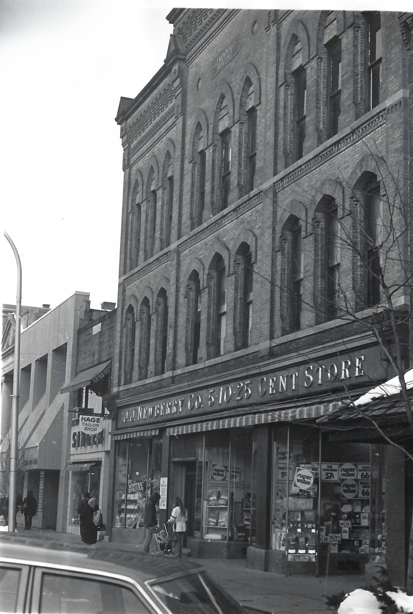 Glimpse above the third-story windows of the building at 43-49 Main Street and you’ll find a stone marking it as the J.J. Newberry Building. Indeed, Newberry’s occupied the structure for sixty-five years from 1927-1992. But, built in 1879, it was initially known as the Schermerhorn building, later called the A.M. Collins block.