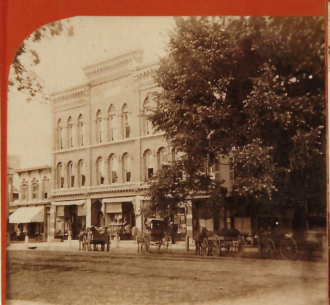 Prior to the block’s construction, it appears that there were two separate frame structures on the lot, one serving as James A. Schermerhorn’s law office, and the other housing various businesses. These include the drug store of Aaron Sager from 1857-1861, and a shoe business owned by a revolving door of partnerships (Fitzgerald & Ferguson or Fitzgerald & Rice (1867-1868); Fitzgerald, Rice & Purdy circa 1868; C. Van Alstine & Henry Purdy between 1869-1873; Rice & Hale between 1874-1876; then Van Alstine alone during 1876-1879).