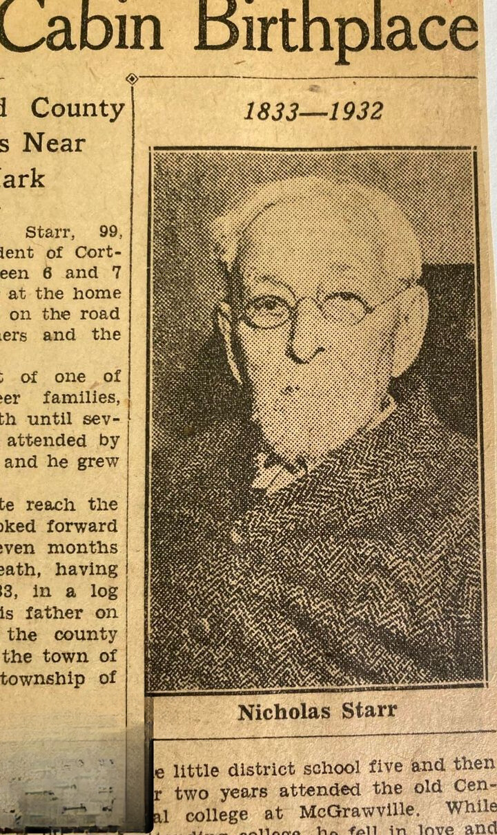 Later in his life, Nicholas Jr. would recall memories from the span of his long life. He lived to be 99 years old, and he could recall stagecoaches, the plank road, and tollgates. He remembered the first rail being laid for the railroad and when everything from Greenbush Street to the Tioughnioga River in the village of Cortland was pasture with just a few sparse dwellings. He was five before his family could replace their log cabin home with a frame house. He recalled that matches were one of the greatest inventions in his lifetime, but they were a luxury for the rich. Starr reminisced about fiddlers at dances and huskin’s for entertainment (probably communal corn husking to lighten the work of harvest time), and he talked about driving his father’s yoke of oxen as a boy.