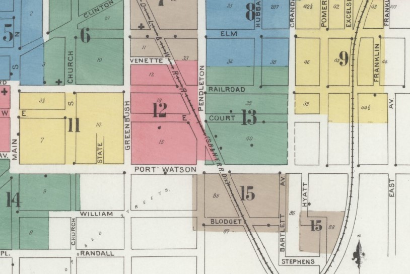 There is no street sign to indicate it’s there, but believe it or not, Blodgett Street still exists, kind of. If you look at this 1902 Sanborn Insurance map, you can see it is parallel to Port Watson Street and a turn off from Pendleton Street. On the Google map, it is merely the entrance to a parking area.