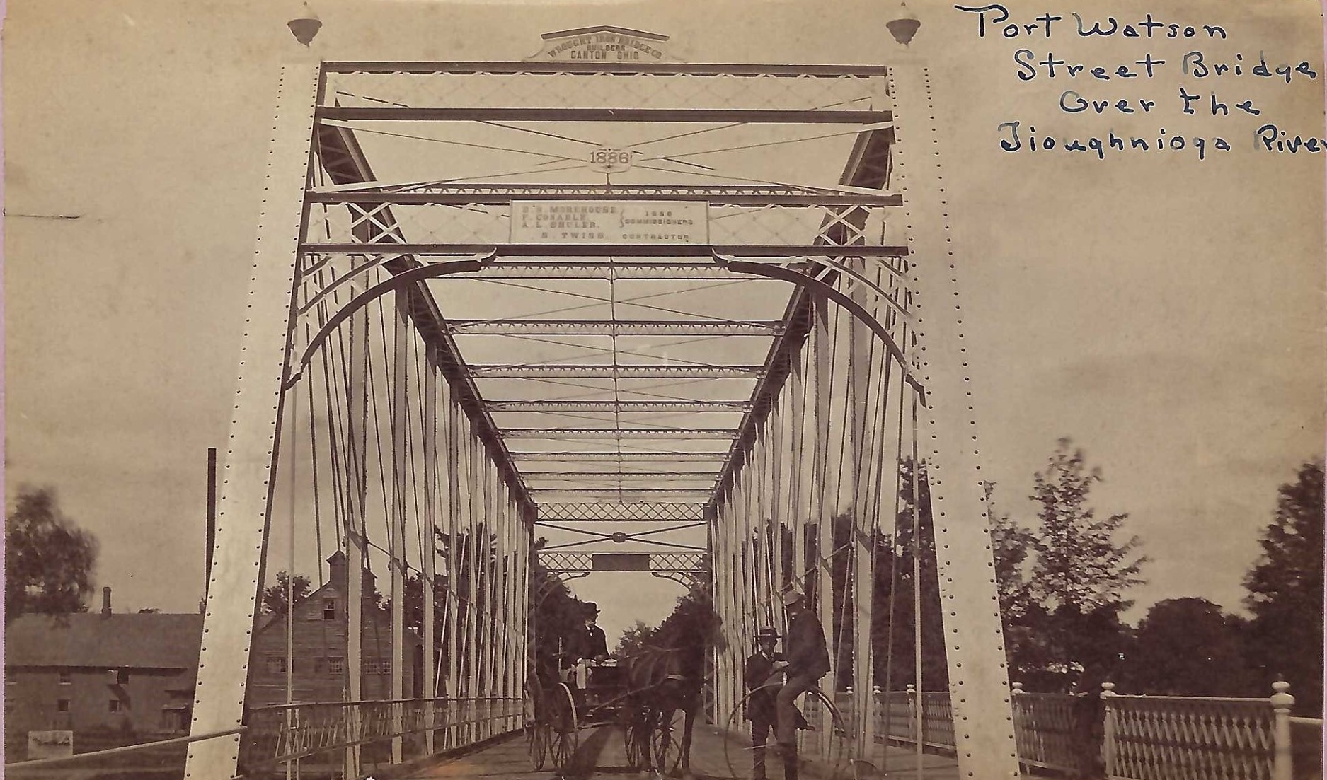 Another bridge that was interesting was the covered wooden bridge in Cincinnatus which was built after an existing bridge was washed out in April of 1865. It was on Main Street, over the Otselic River. An ordinance was passed that anyone riding or driving faster than a walk across the bridge would be fined $3. The bridge was lighted in 1900 and was ultimately taken down in 1902 when traffic increased due to the growing automobile industry. A covered bridge in Willet was taken down approximately ten years before this one. The Cincinnatus covered bridge was sold to A.T. Brannon for $21.