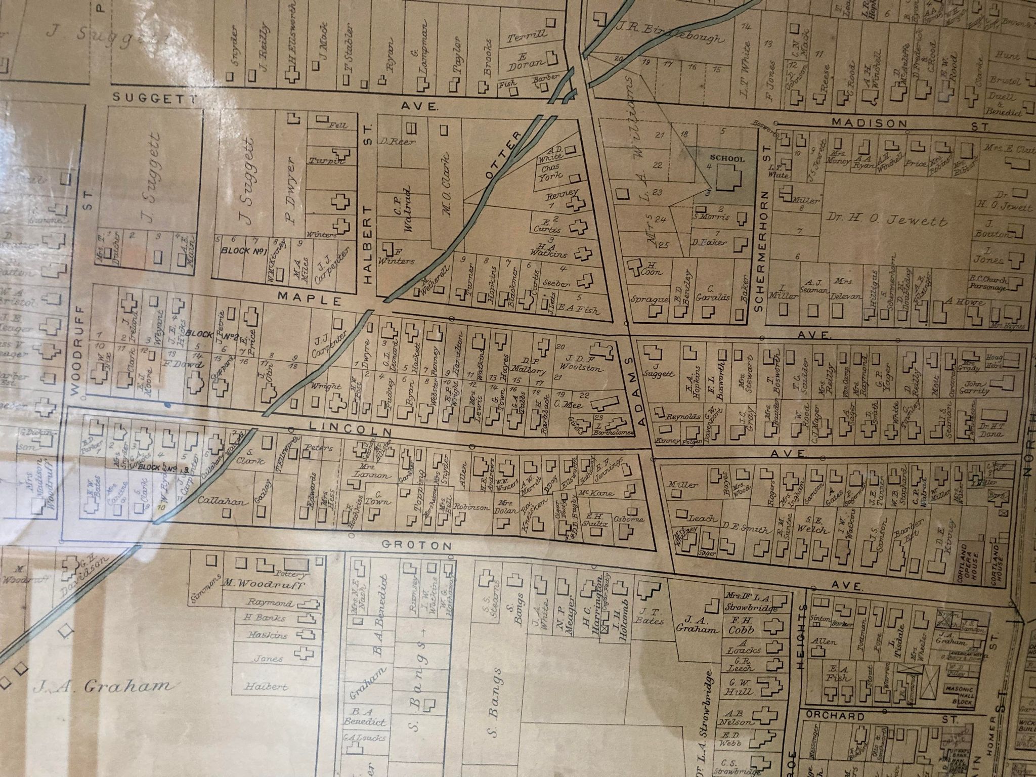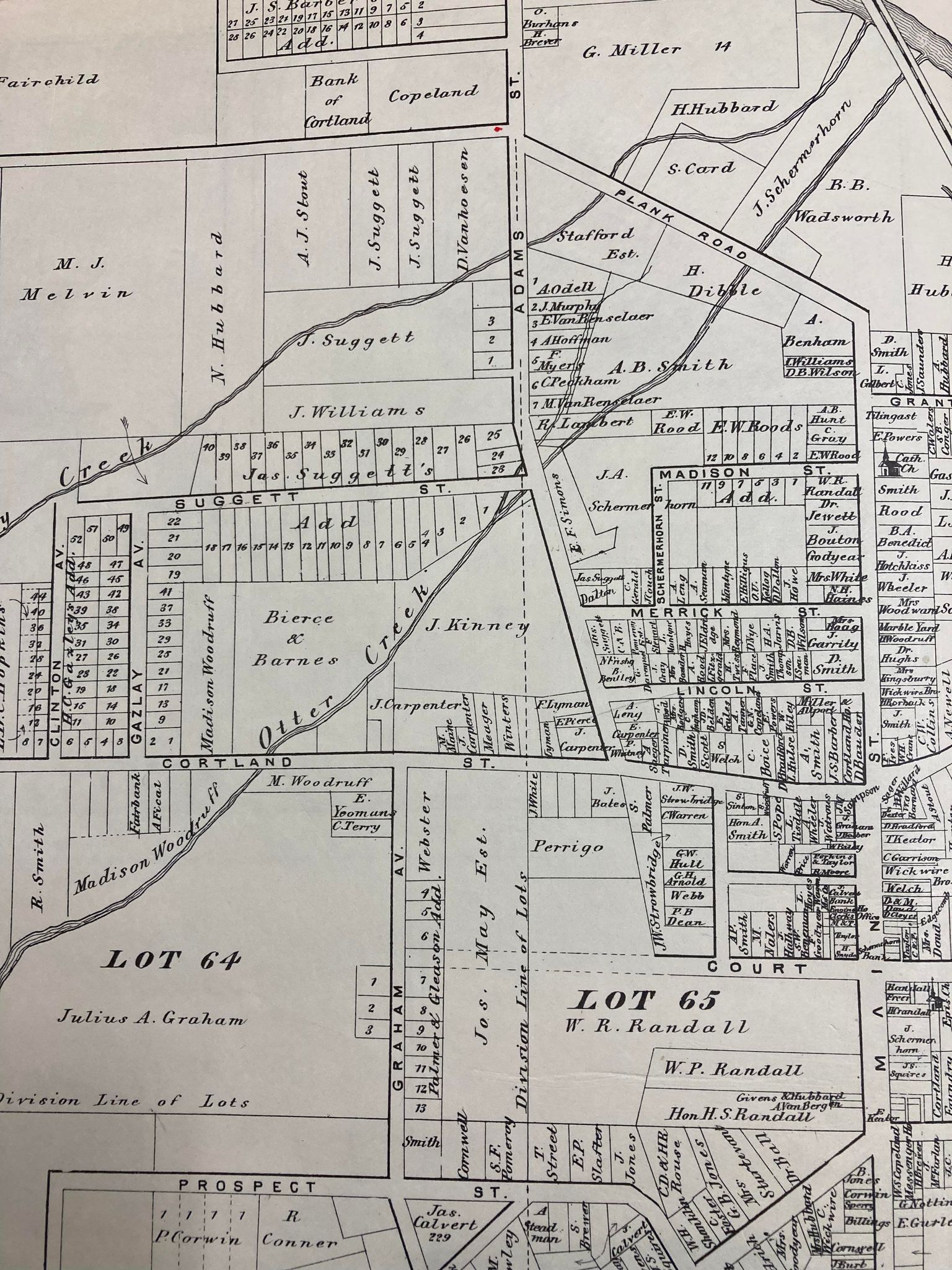 In 1865, he made $30,000 (worth $522,176 today). In the years from 1865-1868, Suggett’s income was over $50,000 a year. He used his money to acquire land which was later sold for a great profit. There was also a construction company which was in his wife Jane’s name which built houses on the land James owned. (This was a very unusual practice at that time since women did not typically own property or run businesses.) The lots were divided into ½ acre or less lots and sold with a home ready to move into. Were they the first housing developments in Cortland? Perhaps! The Suggetts had a team of laborers who built these homes; brother-in-law Thomas Ellsworth was a carpenter, Robert Dalton was a mason, and a fellow with the surname Merrick painted and papered the finished homes. Houses sold for $300-$1200 each.