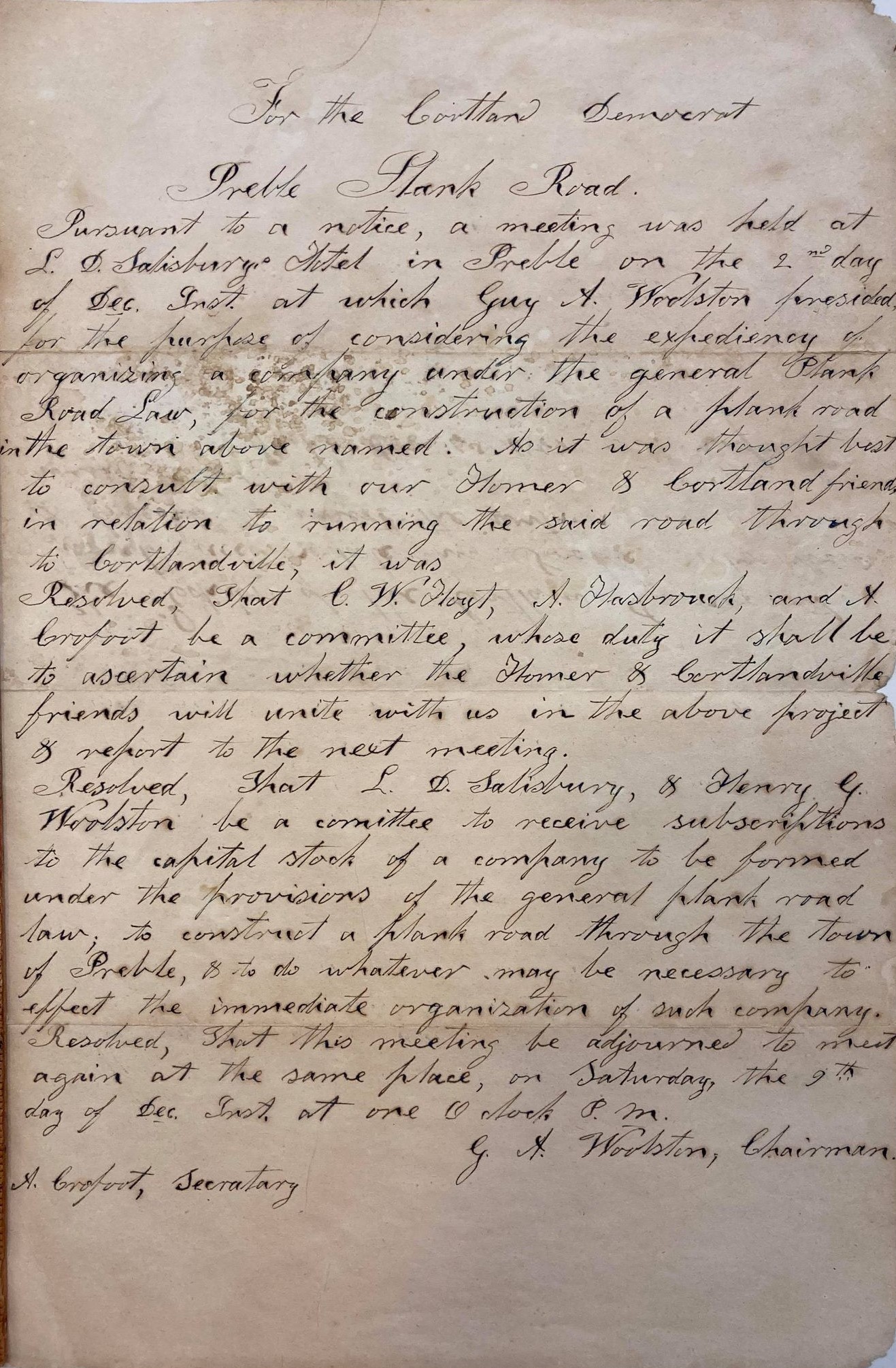 When I started working at CCHS eight years ago, I had never heard the term “plank road,” and I bet many of you have never heard the term, either. A plank road is exactly that, a road made of wooden planks. Two parallel stringers were covered with planks of wood 3-4 inches thick and 8 feet long. The planks were not secured to the stringers, but they stayed in place because of their own weight. The ends of the planks were not trimmed because the extra projections were often useful when wheels went off the road. In my mind, it does not seem like it would be visually pleasing! Surprisingly, plank roads were fairly smooth and provided a good surface for wheeled vehicles. Although initial construction for plank roads was low, maintenance was expensive. Horseshoes cut into the wooden planks, and both water and sun contributed to deterioration.
