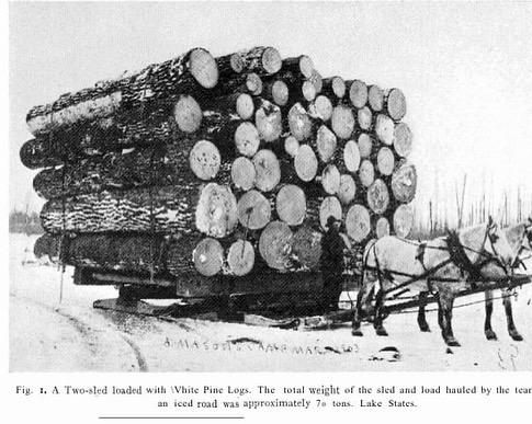 Have you ever wondered how on EARTH our ancestors built stone houses, bridges, and walls all over the place? How did they move all those stones? Or how about how they moved logs for building homes or for firewood? I suppose I always thought they used wagons, but after reading Eric Sloane’s books and seeing many references here at CCHS, they did not use wagons for a variety of reasons. They used sleds. To me, a wagon wheel seems like it’s sturdily constructed and that it would handle the rough conditions of work and travel in the past, but wagon wheels are actually pretty delicate and require upkeep to keep them in perfect working order. The heavier the loads and the rougher the roads, the worse the wear and tear on the wheels. Enter the sled. Sleds were low tech, could be used on snow or any other terrain, and were rugged enough to carry just about anything. For instance, I found an amazing photo of a sled loaded with logs in a book entitled “The Transportation of Logs on Sleds” by Alexander Michael Koroleff and Ralph C. Bryant, published in 1925.